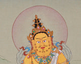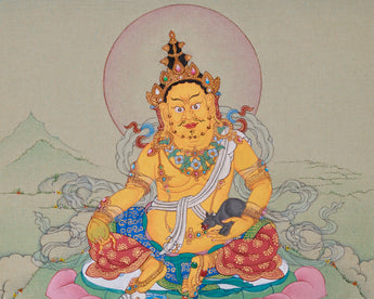 In the thangka, Yellow Dzambhala is depicted in his traditional iconographic form, seated on a moon disc upon a lotus, symbolizing purity and an enlightened mind. His body is painted in a warm golden-yellow hue, which radiates wealth, generosity, and spiritual prosperity. In his right hand, he holds a citron fruit, representing abundance and the fulfillment of both worldly and spiritual wishes. His left hand cradles a black mongoose named Nehulay, symbolizing Dzambhala's power to eliminate poverty and promote prosperity. The thangka also features a conch shell and a treasure vase, symbolizing the unending flow of wealth and blessings. This artwork serves as a powerful spiritual support for those seeking prosperity and inner transformation.