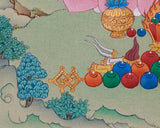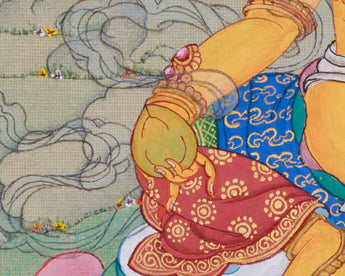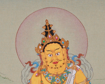 The Mini Yellow Dzambhala thangka is hand-painted on fine cotton canvas using natural stone colors and is adorned with genuine 24K gold accents. This artwork adheres to the traditional Karma Gadri style, characterized by clean compositions, open spaces, and soft, flowing landscapes that emphasize the central deity. The use of natural stone colors provides a matte, earthy texture that adds depth while preserving the purity of the sacred tones.