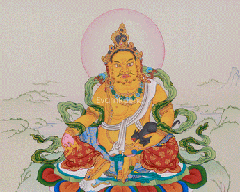 This beautiful thangka features Yellow Dzambhala, the Tibetan Buddhism wealth deity, sitting gracefully on a lotus throne and radiating vibrant energy. His golden-yellow color symbolizes abundance and prosperity. He stands with a fierce expression and stance, serving as a protector and obstacle remover. He holds a citron fruit in one hand, representing the fruits of wealth, and a mongoose in the other. The carefully painted wealth jewels surrounding him highlight his connection to both material and spiritual abundance, offering protection and blessings to everyone who seeks his help. Invite the blessings of abundance and protection into your home with this Thangka—order today and let his powerful energy fill your space with positivity and prosperity!