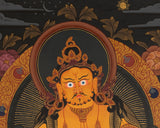 This Thangka beautifully captures the Wealth Deity, Dzambhala, known in Tibetan Buddhism as the Buddha of Wealth. This Thangka was hand-painted on quality cotton canvas, showcasing the remarkable work of a professional Nepali artist. The artwork's intricate elements come alive with acrylic colors, resulting in rich tones that enhance visual impact. Genuine 24K gold accents enhance the deity's adornments, giving the piece a divine shine. The traditional style in this masterpiece depicts Dzambhala's sacred iconography, emphasizing the artwork's spiritual and cultural value. The Thangka's durability and long-lasting beauty are ensured by its high-quality materials and beautiful work of art.