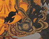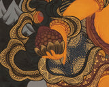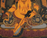 Seated in a majestic pose on a lotus, Dzambhala’s rich golden skin tone symbolizes abundance, success, and spiritual wealth, while vibrant floral designs emphasize his connection to prosperity. His expression is furious, conveying a sense of power and protection consistent with his role as a guardian of the spiritual and material worlds. His left hand holds a mongoose, a symbol of riches and treasures, indicating his capacity to provide fortune, while his right hand holds a citron fruit, signifying the granting of wealth. This Thangka is a powerful spiritual aid, bringing blessings of abundance, protection, and good fortune to the area it graces.