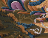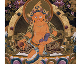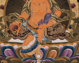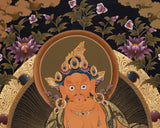 Dzambhala is surrounded by a magnificent array of vibrant, flowing colors that radiate a sense of abundance and spiritual wealth. His orange skin tone and lavish attire, adorned with beautiful gold designs, symbolise his divine status. His left hand holds a mongoose, a symbol of riches and treasures, indicating his capacity to provide fortune, while his right hand holds a citron fruit, signifying the granting of wealth. The detailed use of gold highlights the richness of his character, representing the manifestation of spiritual and material wealth. This Thangka is a powerful spiritual aid, bringing blessings of abundance, protection, and good fortune to the area it graces.