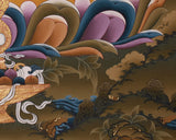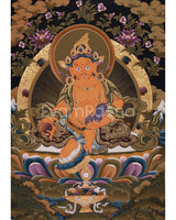 The Wealth Deity Dzambhala Artwork represents the revered Buddhist deity who bestows prosperity, good fortune, and abundance on his followers. This Thangka is hand-painted on high-quality cotton canvas, capturing the rich tradition of Nepali artistry. Acrylic colors bring the artwork's intricate details and vibrant hues to life, adding visual depth. Genuine 24K gold accents are delicately applied throughout the painting, highlighting key elements and adding a divine radiance to the depiction of Dzambhala. This traditional piece illustrates the high skill level and dedication to detail, ensuring its spiritual significance and lasting beauty.