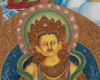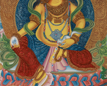 Enhance your spiritual environment with our Yellow Dzambhala, The Wealth Deity Thangka, a striking depiction of the Tibetan Buddhist deity of prosperity. His strong yet compassionate personality represents his ability to remove financial obstacles and shower followers with wealth, and he is admired for bestowing both material and spiritual wealth. He has a citron fruit in his right hand, a sign of good fortune, and a mongoose spitting gems in his left, representing boundless abundance. Vibrant acrylics were meticulously hand-painted on this stunning work of art, guaranteeing a rich, long-lasting finish. It has gold embellishments on a cotton canvas, producing a striking contrast that emphasizes the religious element.
