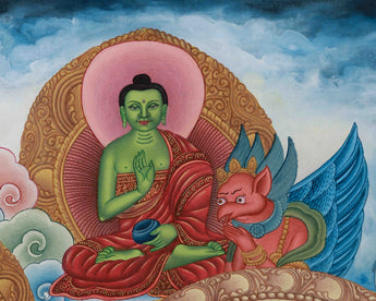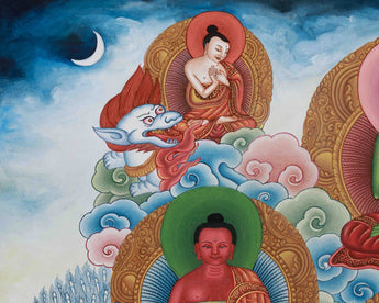 The five Dhyani Buddhas, each representing a distinct aspect of the Buddha's wisdom and attributes, are depicted at the top and the right side of the Thangka. The five Dhyani Buddhas comprise Ratnasambhava, Akshobhya, Vairochana, Amitabha, and Amoghasiddhi. Traditionally associated with the five elements and directions, these Buddhas embody the Five Wisdoms. They are shown in serene poses, radiating knowledge and tranquility. Each of the five primordial wisdoms these Buddhas represent is connected to a specific color, direction, or facet of spiritual enlightenment. A bodhisattva and white Tara are seen on the left. These female Bodhisattvas are linked to eliminating barriers and represent healing, compassion, and protection.