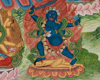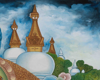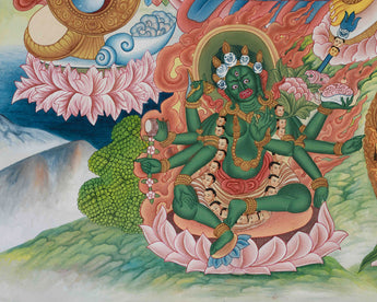 The thangka also shows furious deities beneath Dzambhala, such as Mahakala, who stands for converting evil energy into positive spiritual powers. The Bodhisattvas beneath these deities emphasize the necessity of loving action and the desire to achieve enlightenment for the benefit of all beings. This thangka's background is rich and colorful, with trees, landscapes, and flora. These components stand for harmony, fertility, and prosperity. The idea that Dzambhala's prosperity is not simply material but a part of a greater cosmic order is further supported by the clouds and greenery framing the thangka, lending a sense of calm and spiritual harmony. The background's vibrant hues and gold highlights emphasize the deity's heavenly presence even more, giving the material and spiritual worlds a sense of depth and transcendence.
