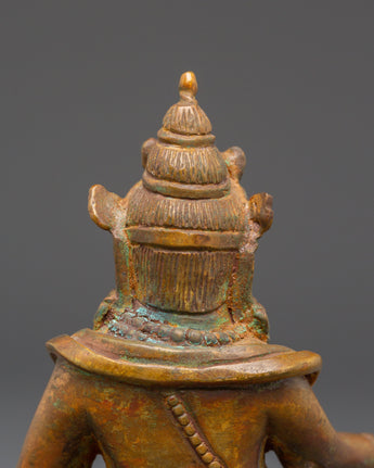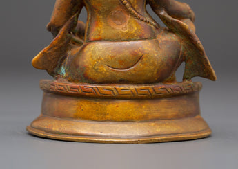 The Buddhist Wealth Lord Dzambhala Statue is a stunning copper sculpture measuring 11.5 cm in height and 8.5 cm in breadth, weighing 0.41 kg. This statue, meticulously carved by talented Himalayan artisans, represents the Tibetan god of wealth and success, Dzambhala, the benevolent protector who bestows abundance and spiritual fortune. Dzambhala sits beautifully with a confident posture, holding a mongoose that spits jewels, representing generosity, prosperity, and protection from shortage.