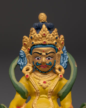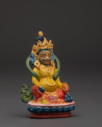 Dzambhala is a protective deity associated with wealth and prosperity. Many forms and traditions are associated with this wealthy deity, but he is usually depicted as yellow in color and holding a mongoose in his left hand. This statue has accurate traditional iconography and fine details.