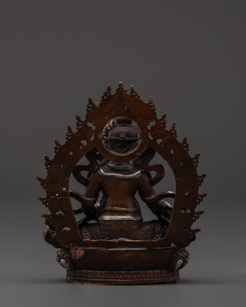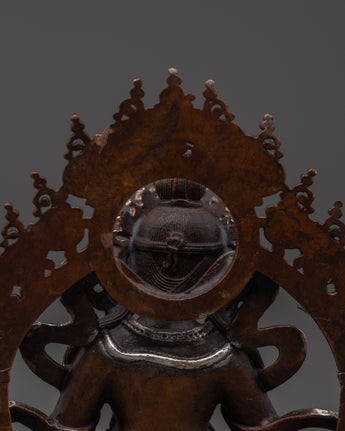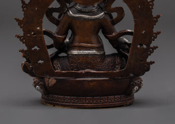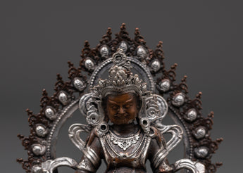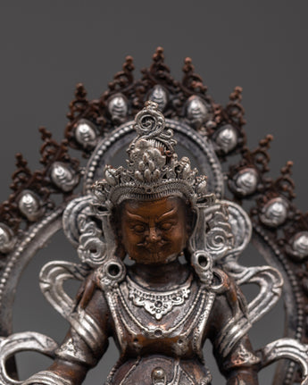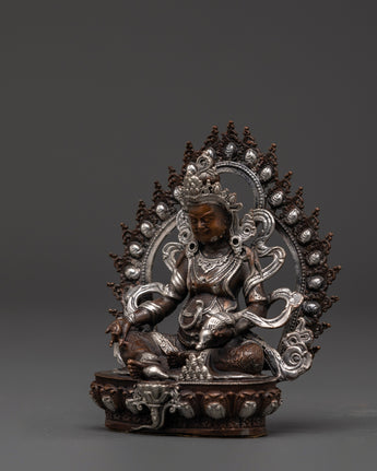 This statue, expertly carved from oxidized copper and silver-plated, stands 9.5cm tall and 8cm broad and weighs 0.20kg, making it ideal for a home altar, meditation space, or sacred corner. Every feature of Dzambhala's form, from the regal crown to the mongoose representing wealth, reflects traditional Himalayan craftsmanship and profound spiritual symbolism.