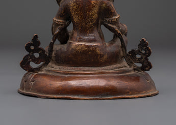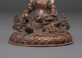 The beauty of this Dzambhala statue exemplifies religious symbolism. The mongoose in his hand, which is frequently represented releasing gems, demonstrates abundant prosperity, while the lotus base denotes spiritual progress and purity. The intricate details of his jewelry, along with his calm expression, highlight his dual role as protector and benefactor. Placing this sculpture in your home or shrine is thought to bring prosperity, generosity, and harmony to both spiritual and material life.