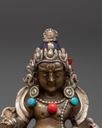 Expertly sculpted by skilled artisans using traditional methods, this statue is oxidized and hand-polished to achieve a antique finish. Its regal expression, flowing robes, and intricate crown embody Dzambhala’s protective and compassionate spirit. The embedded stones—turquoise for healing, coral for protection, and silver for purity—are believed to boost spiritual energy. This meaningful piece serves as both a thoughtful gift and a powerful tool for prosperity rituals and spiritual devotion.