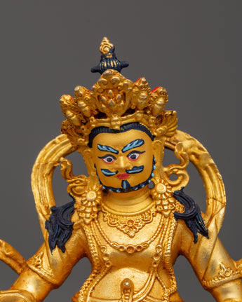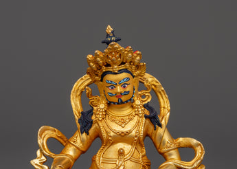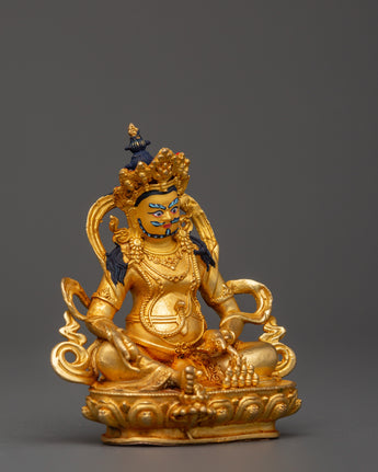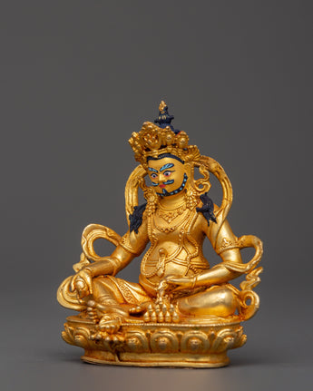 Dzambhala is a protective deity associated with wealth and prosperity. Many forms and traditions are associated with this wealthy deity, but he is usually depicted as yellow in color and holding a mongoose in his left hand. This statue has accurate traditional iconography and fine details.