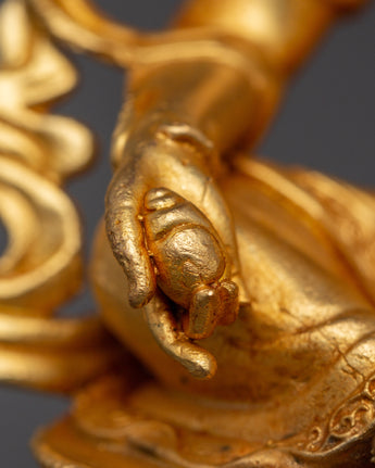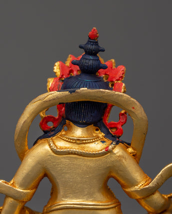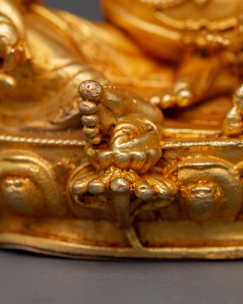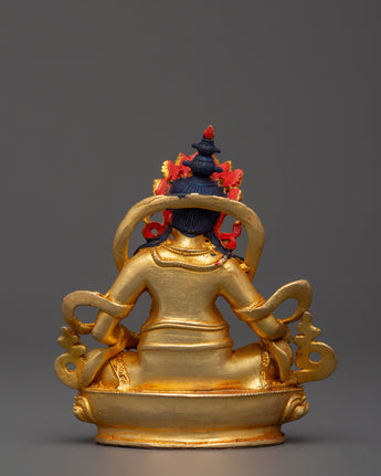 Dzambhala is shown sitting, holding a mongoose in his left hand to represent the removal of material and spiritual impediments, while his right hand holds a precious "mani" citron fruit. Dzambhala's strong yet sympathetic visage reminds practitioners of his protective nature and capacity to alleviate poverty by providing spiritual and practical gifts. The intricate engravings on his flowing robes, ornaments, and religious symbols demonstrate amazing craftsmanship, making this statue a reminder of the blessings of abundance and generosity.
