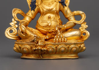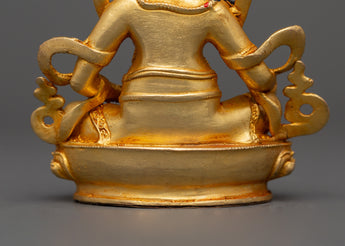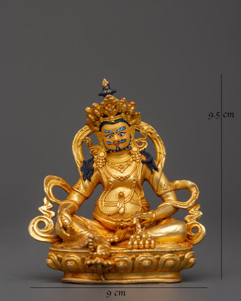 This hand-crafted Dzambala statue is made of copper with a gold-plated finish and is 9.5cm in height and 9cm in breadth. Weighing 0.24kg, it represents the powerful Tibetan deity of wealth and abundance. Dzambala, revered throughout Buddhist traditions, is invoked to attract both material and spiritual wealth. His strong yet compassionate expression conveys his commitment to protecting practitioners from financial hardship and providing them with the gifts of prosperity, good health, and knowledge.
