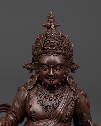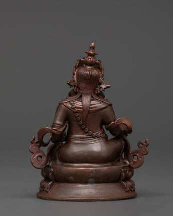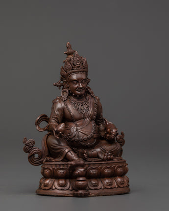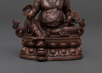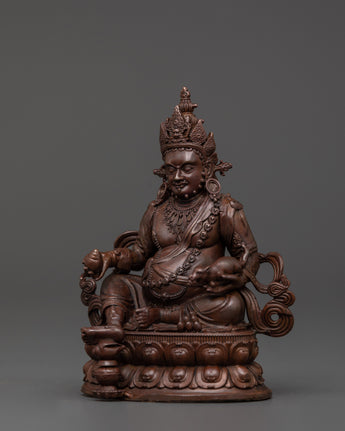 This Oxidized Copper Dzambala Holding Conch is a powerful symbol of the Tibetan Wealth Deity, who is revered for bringing wealth, abundance, and good fortune. Standing 10cm tall and 8cm wide, this intricately made statue rests elegantly on a lotus disc, representing purity and spiritual enlightenment. Dzambala wears a regal crown and clutches a conch in one hand, which is a symbol of wealth and prosperity in Tibetan Buddhism. The statue's copper finish gives it an aged appearance, adding spiritual and aesthetic appeal as a centerpiece for your meditation or altar design.