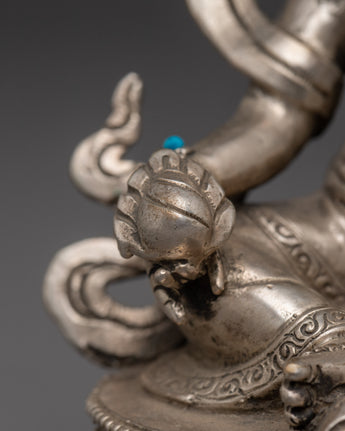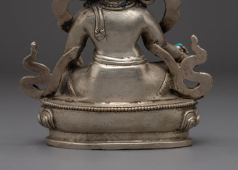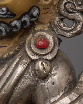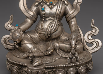 The Dzambhala statue depicts the deity sitting in a loving and blessed stance, holding a treasure dish laden with gems. The silver-plated body and copper frame emphasize Dzambhala's celestial essence, while the coral and turquoise stones give a splash of color and spiritual vitality. Coral is associated with vigor and protection, whereas turquoise is valued for its healing properties and capacity to restore balance and clarity. Together, these stones strengthen the wealth-generating abilities of Dzambhala's blessings, transforming this statue into not just a stunning work of art but also a potent spiritual talisman.