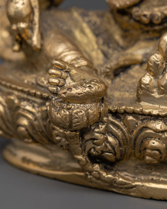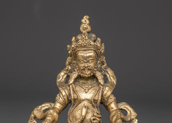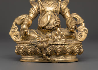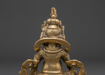 This statue, skillfully cast in brass, stands 15 cm tall, 12 cm wide, and weighs 0.62 kg. Dzambhala is depicted in a royal seated position, holding a mongoose spewing jewels, which represents unending generosity. Every detail, from the facial expression to the lotus base, demonstrates meticulous craftsmanship and a dedication to excellence. A meaningful addition to meditation, rituals, or as a spiritual gift.