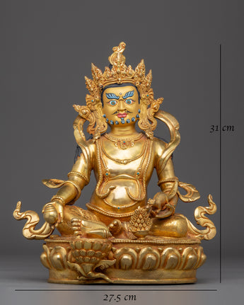 Crafted by artisans from copper, this stunning Wealth Protector Dzambala Statue is exquisitely finished with a bright gold plating that accentuates every feature. This striking monument, which stands 31 cm tall and 27.5 cm wide and weighs about 4.23 kg, commands attention in any setting. The statue's exquisite gold plating and sturdy copper base, which were both expertly crafted, Provide longevity and a striking visual appeal. This Wealth Protector Dzambala Statue combines artistic beauty and spiritual strength, making it ideal for your altar, meditation room, or other sacred area.