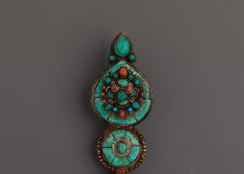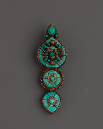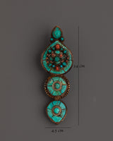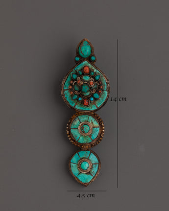 This set of handcrafted copper earrings is a gorgeous fusion of modern style and traditional artistry, making a bold and sophisticated statement. These earrings, which are made of copper and have a dazzling silver finish, are 14 cm tall and 4.5 cm wide. Vibrant artificial turquoise and coral stones accent each piece, capturing the essence of ethnic fashion while adding a dash of modern flair. Each earring is substantial yet lightweight, weighing only 0.116 kilograms, making them both stylish and comfortable to wear.