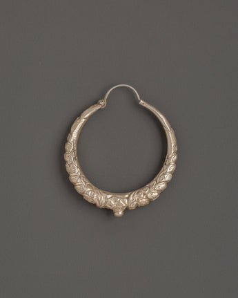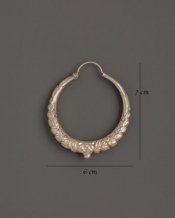 This Handcrafted Tibetan Hoop Earrings Set is wonderfully fashioned and utilizes prehistoric silverworking techniques from the Himalayas. These ethnic silver earrings are 7 cm high and 6 cm wide, with a forceful yet beautiful presence. Each hoop features delicate engravings of braided textures, floral patterns, and subtle curves that mirror Tibetan cultural motifs commonly found in ceremonial and tribal adornments. With a lightweight feel (0.008 kg each), these hoops are ideal for all-day wear, providing comfort and sophistication. Whether you like meaningful jewelry or enjoy the character of boho and ethnic accessories, these earrings add soul and narrative to your collection.