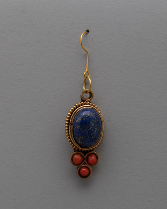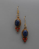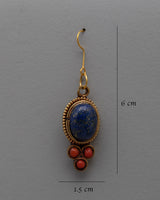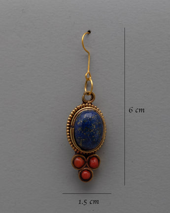 The Dangle Gemstone Earrings, handcrafted on a copper and brass body with electro-gold plating, are a breathtaking example of beauty and craftsmanship combined. The exquisite inlay of semi-precious stones, such as coral and lapis lazuli, accentuates the beauty and allure of these earrings. Any ensemble is given a sophisticated and colorful pop when the coral stones' vivid red contrasts with the lapis lazuli's rich blue.