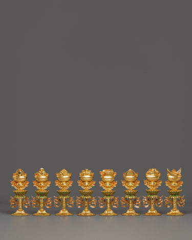 The Eight Auspicious Symbols, known as the "Tashi Targye Gyadzoe" in Tibetan and the "Ashtamangala" in Sanskrit, are sacred symbols deeply rooted in Buddhist tradition. These symbols hold profound spiritual significance, encapsulating critical aspects of Buddhist teachings and blessings. They play a prominent role in the religious practices of Tibetan Buddhism and the Himalayan region.
