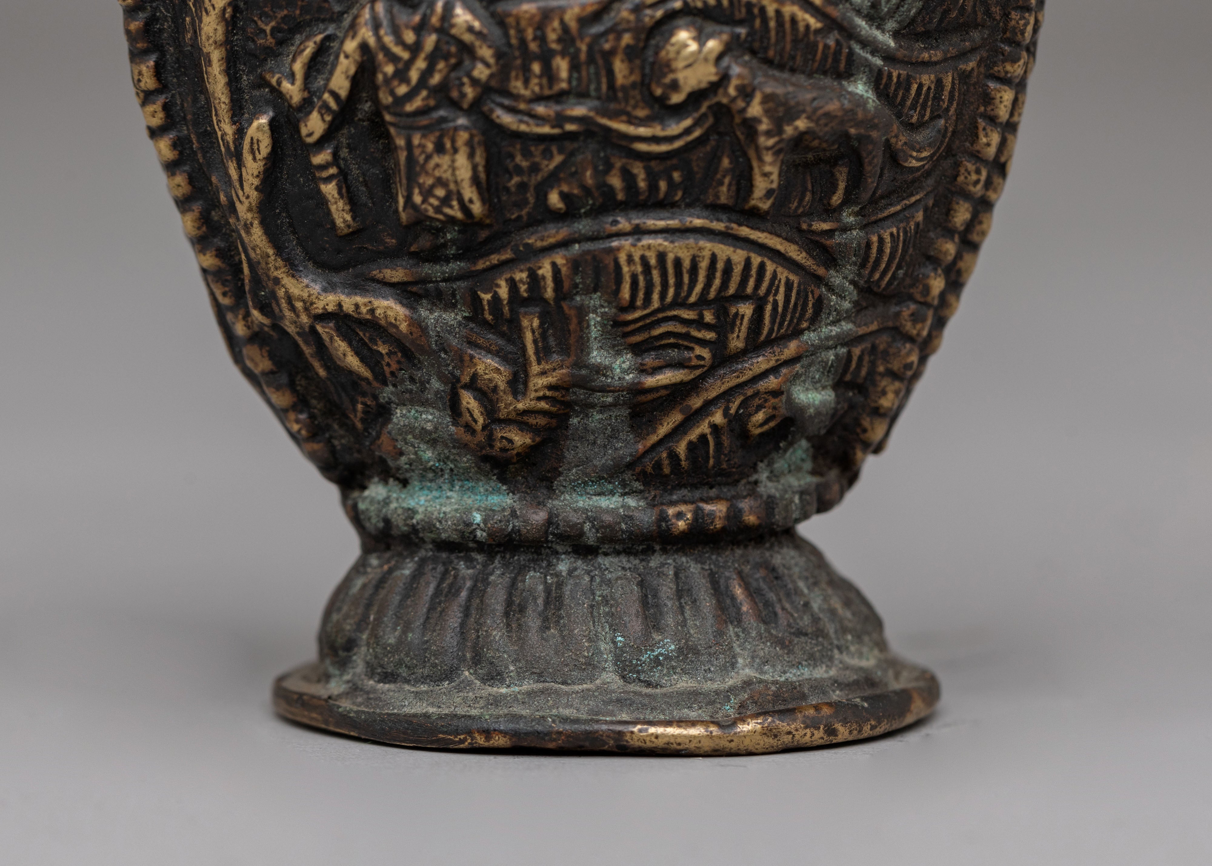 This handcrafted brass snuff pot is beautifully adorned with an antique finish and features the Four Harmonious Friends—a traditional Tibetan Buddhist symbol representing unity and friendship. Its delicate design showcases each animal's intricate detailing, with a Rabbit, monkey, bird, and elephant intricately carved around the pot, symbolizing harmony, balance, and cooperation. This unique snuff pot serves as both a functional piece and a meaningful decorative object for any home or sacred space, embodying the values of friendship and unity.