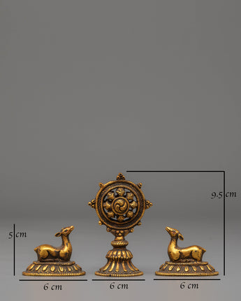 Bring Buddhist symbolism into your spiritual space with this Buddhist Ritual Dharma Wheel Set, complete with the sacred Dharmachakra and a pair of serene deer statues. Measuring 9.5cm x 6cm for the wheel and 5cm x 6cm for each deer, this compact yet powerful altar set carries deep spiritual significance. Crafted from oxidized copper and gold-plated detailing, it is designed to elevate meditation rooms, home shrines, and ceremonial spaces with authenticity and reverence.