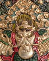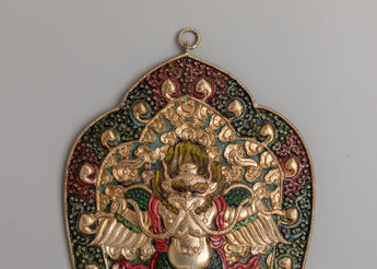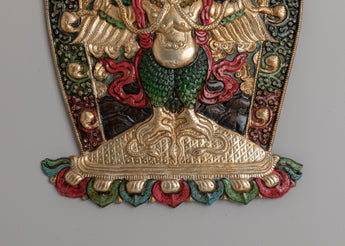 This exquisite Garuda Protector Wall Hanging, handcrafted from copper and beautifully painted with acrylic colors, depicts the mythical Garuda bird, a revered figure in Buddhist and Hindu traditions. At 28 cm high and 19 cm wide, it makes a dramatic statement in any setting. The vibrant acrylic paint brings the Garuda to life, showcasing its majestic form and intricate details, from the powerful beak to the flowing feathers.