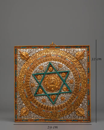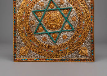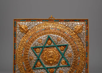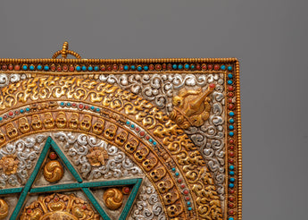 This Handcrafted Wall Hanging Buddhist Mandala is a beautiful ritualistic art piece designed to enhance any spiritual space. Crafted from copper, electro gold plated, and electro silver plated, this Mandala measures 32cm in height and 29cm in width, with a weight of 1.12kg. The Mandala features intricate gemstone accents, including turquoise, coral, and lapis lazuli, adding an extra layer of symbolism and beauty. Ideal for Buddhist altars, meditation rooms, or sacred spaces, this mandala represents the unity of the universe and the path to spiritual enlightenment.