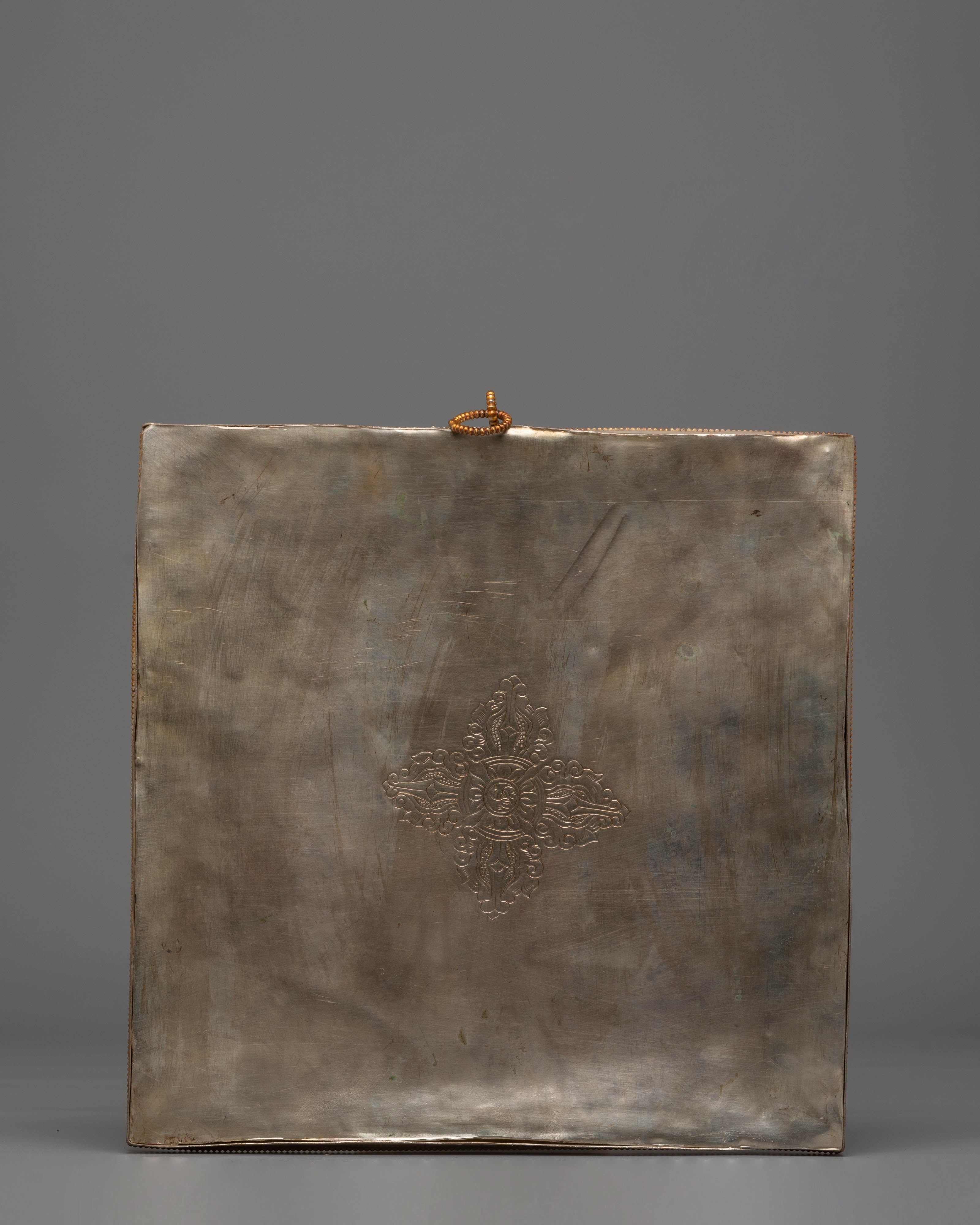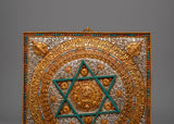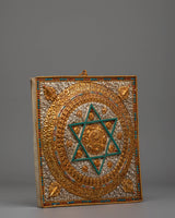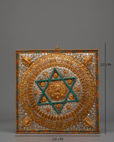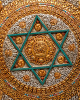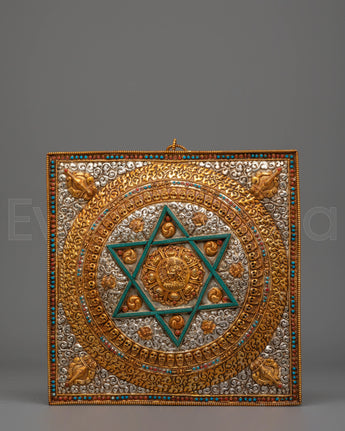The Buddhist mandala at the center of this piece symbolizes the cosmic diagram, often representing the unity of body, speech, and mind in the path toward spiritual awakening. The six-pointed star motif, with its electro gold accents, stands for the interdependence of all things, while the vibrant gemstone detailing enhances its sacred meaning. Skull motifs surrounding the central mandala symbolize the transformation of the ego, reminding us of the impermanence of all things. The design reflects the spiritual essence of Buddhism and Tibetan traditions, making it a powerful decorative object and a spiritual tool.