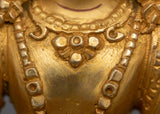 The Amitayus statue Deity of Longevity, measuring 5.5” (14 cm) in height and 3.9” (10 cm) at the base, is a representation of the Buddha of Infinite Life. Crafted from a copper body, the statue is adorned with 24K gold gilding and enhanced with intricate gold and acrylic paintings, showcasing its fine artistry.