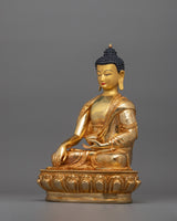 The Shakyamuni Enlightened Buddha Sculpture's calm demeanor and enlightened understanding are beautifully captured measuring 9.4 inches (24 cm) at its base and 13.4 inches (34 cm) in height. It weighs 4.45 kg.