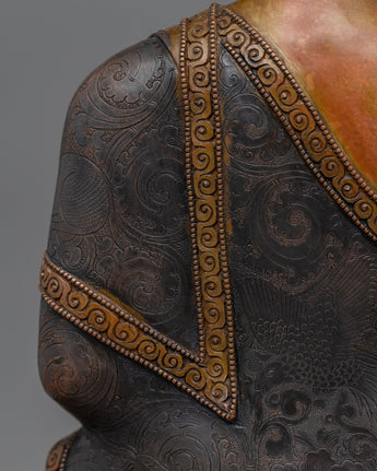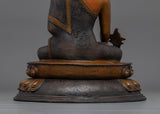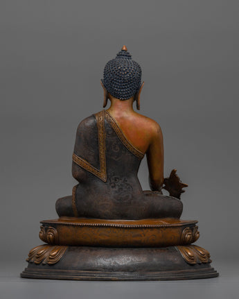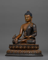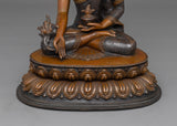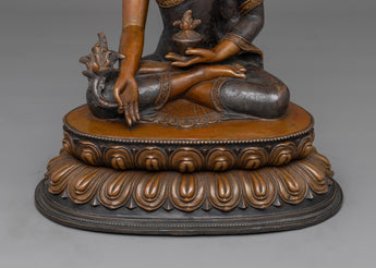 Bhaisajyaguru Healing Deity "Medicine Buddha" is a finely carved statue created by talented artisans in Patan, Nepal, a place known for its long legacy of Buddhist art. This statue is an important focus for meditation, supporting health, balance, and enlightenment in one's spiritual path. It is composed of an intricately carved oxidized copper body that represents the artists' dedication and skills. It measures 11.2"/28.5cm (Height) with a base width of 9.8"/25cm and weighs 3.12 kg.
