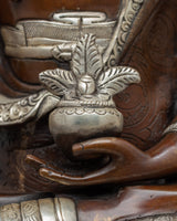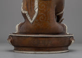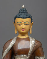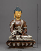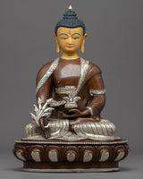 The Buddhist Deity Bhaisajyaguru Medicine Buddha Statue was exclusively hand-crafted by Nepali artists at their studio using intricate design patterns. We used oxidized to mold the figurine. Here in the statue, the deity is depicted as having a calm look while sitting on a moon disc lotus, holding a vase in his left hand and a myrobalan plant in his right. We have gilded the face using genuine 24K gold. The kasaya robes, vase, and medicine plant are silver-plated. We have also used acrylic paintings on the statue to highlight the facial attributes. The combination of an oxidized copper body, silver plating, and the gilded gold face gives this statue a captivating appearance.