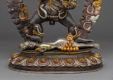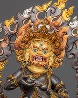 Traditionally crafted, the Black Dzambhala statue was handcrafted by our most skilled craftsmen from Nepal. Crafted from a copper body and then gilded with 24k genuine gold. The statue of the Dzambala's iconography denotes development and increase, from his skin's deep gold hue to his bulky build denoting riches, from the mongoose spewing wish-fulfilling diamonds to the fruit he is carrying. The right leg is extended, pressing upon the yellow Lord of Wealth beneath his foot. A fiery halo rages behind the deity. The elegant gold-plated and acrylic painted halo illuminates his face, while the wonderfully carved lotus seat is seen as mesmerizing.