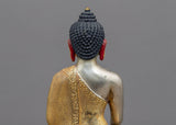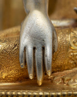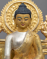 We have beautifully crafted the Bodhgaya Buddha Shakyamuni Statue in our studio with the skillset and technique inherited over centuries. This is a unique art craft as it is molded using copper and has gold gilding and silver plating. We have silver in the body, while the rest of the figurine includes a face, and the throne itself has been gilded with genuine 24K gold. In this statue, we have depicted the deity seated on a handmade lotus throne set. We have spent months and months with complete devotion to crave this statue set of Historical Buddha. The deity is shown in a cross-legged pose while seated on the throne. He does the earth-touching mudra with his right hand, representing his gained Enlightenment while holding an alms bowl in his left and right hands.