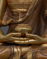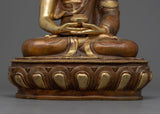 This meticulously carved statue of Buddha Amitabha in his distinctive mudra evokes a deep spiritual resonance by capturing the deity's aura in its entirety. This masterwork, which stands 12.5 inches tall, captures every feature, from the Buddha's serene facial expression to the intricate fabric of his robes. The tarnished copper body ensures longevity while adding ageless appeal, and the 24k gold gilding, mixed with bright acrylic paintings, gives the statue an ethereal light. The craftsmanship not only honors the deity but also the long history of Buddhist artwork.