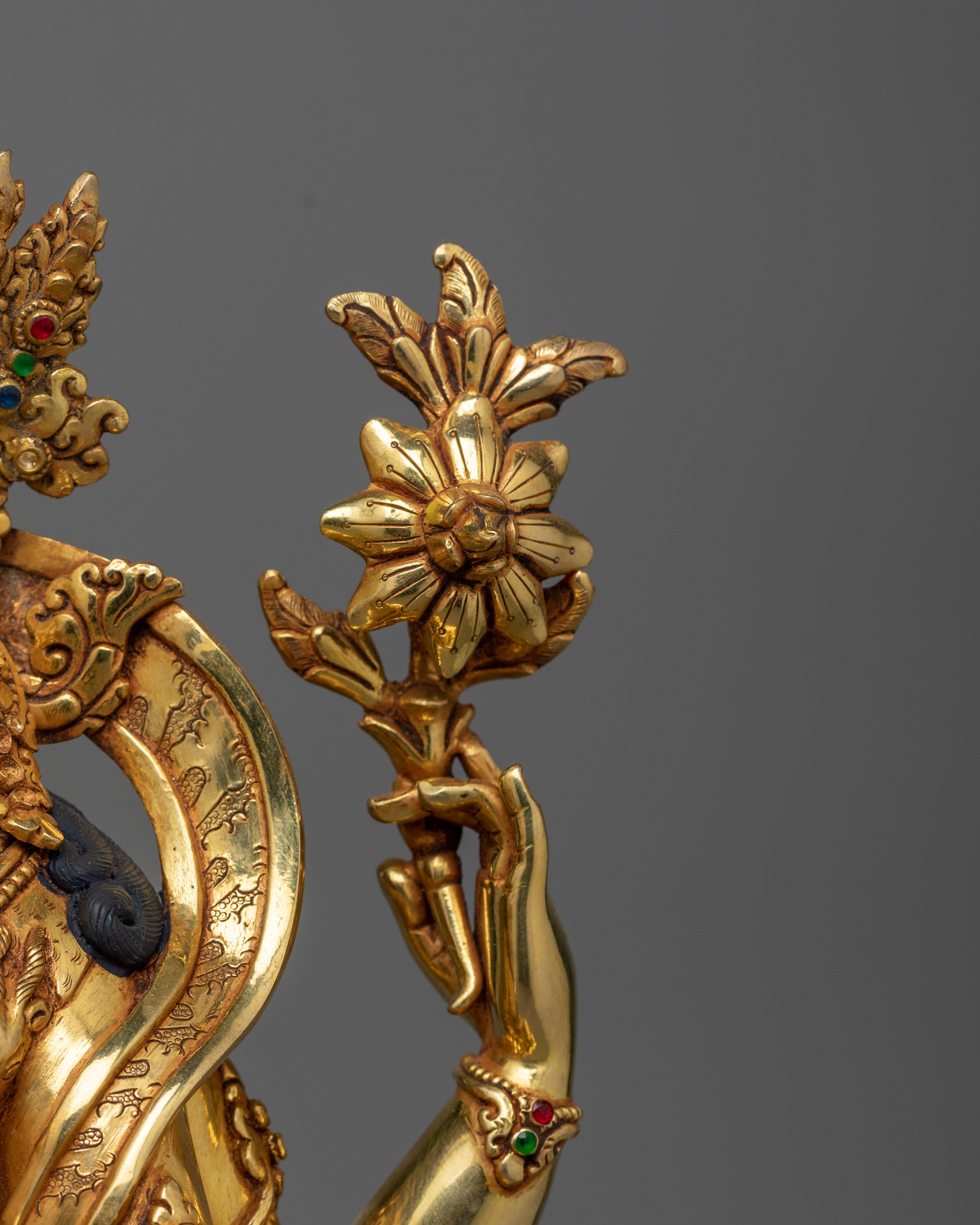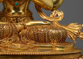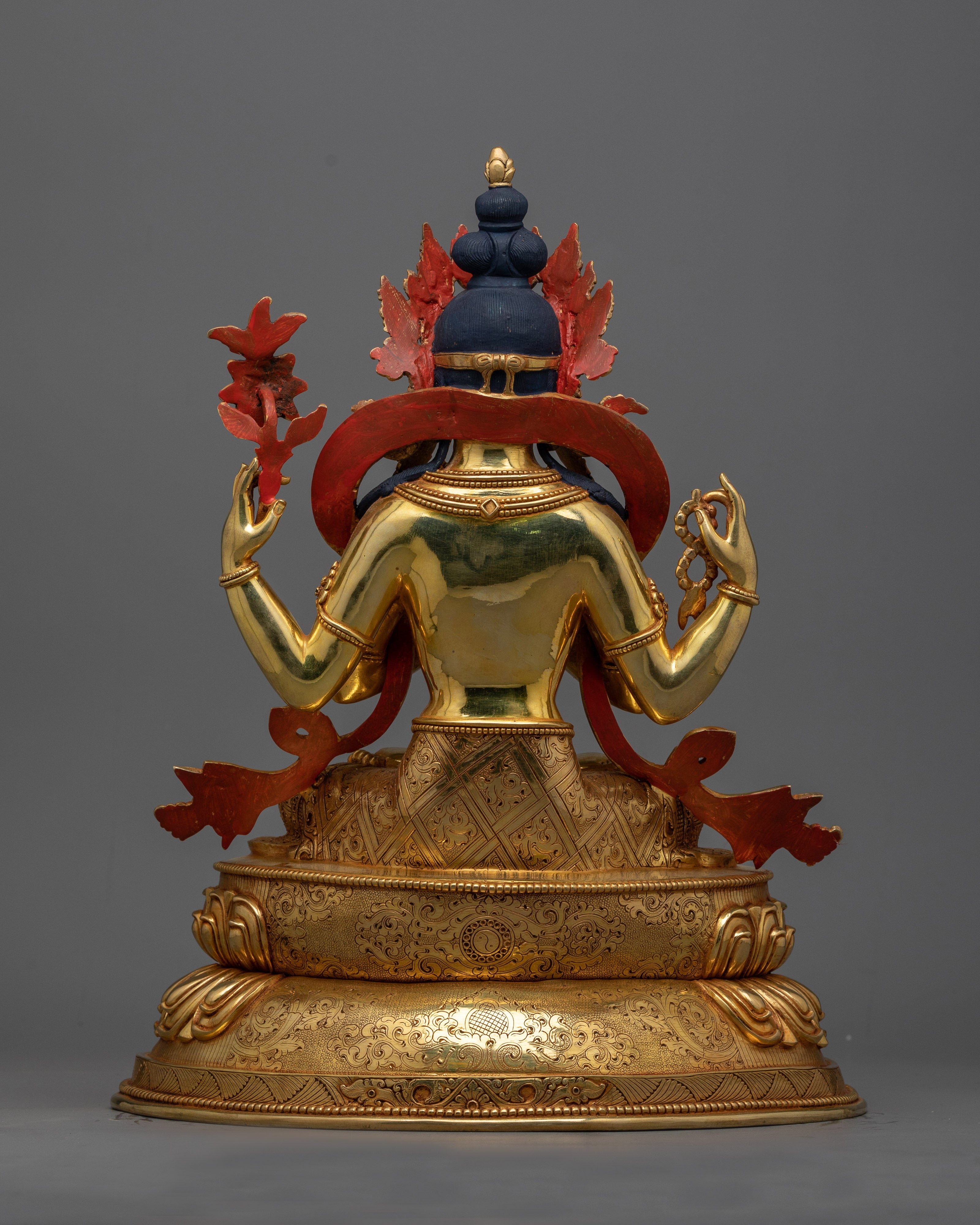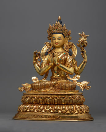 He is depicted sitting on a double lotus seat with a compassionate expression. His two front hands are, in a holy gesture, clasped in front of his jewel-draped heart. His upper right hand holds his special symbol, a crystal akshamala, or rosary, a symbol of the never-ending cycle. The statue comprises triple-Layered Gold, 3D Embossed Carving with Deep Multi-Layered Engraving, and High-Quality Semi-Precious Stones.