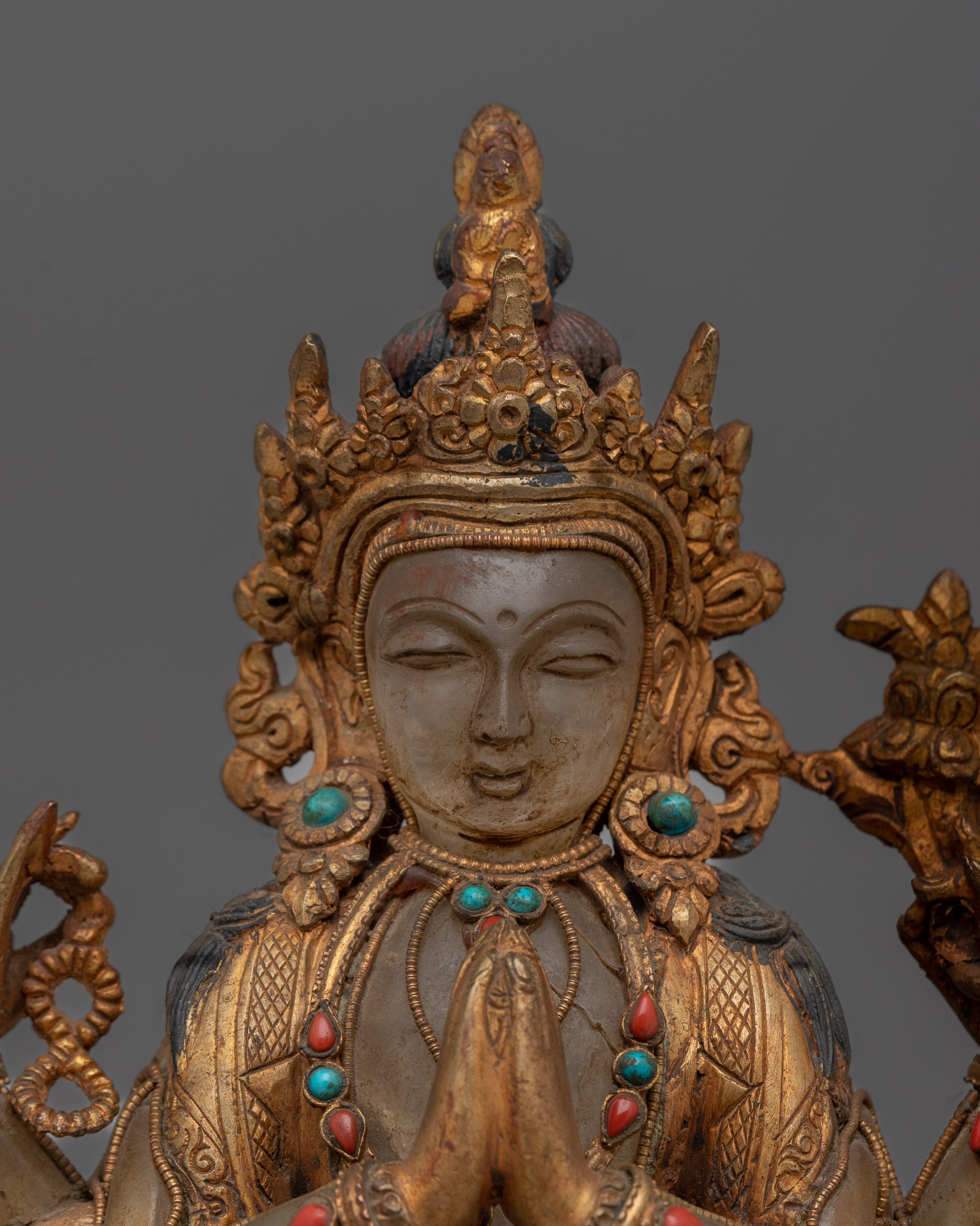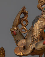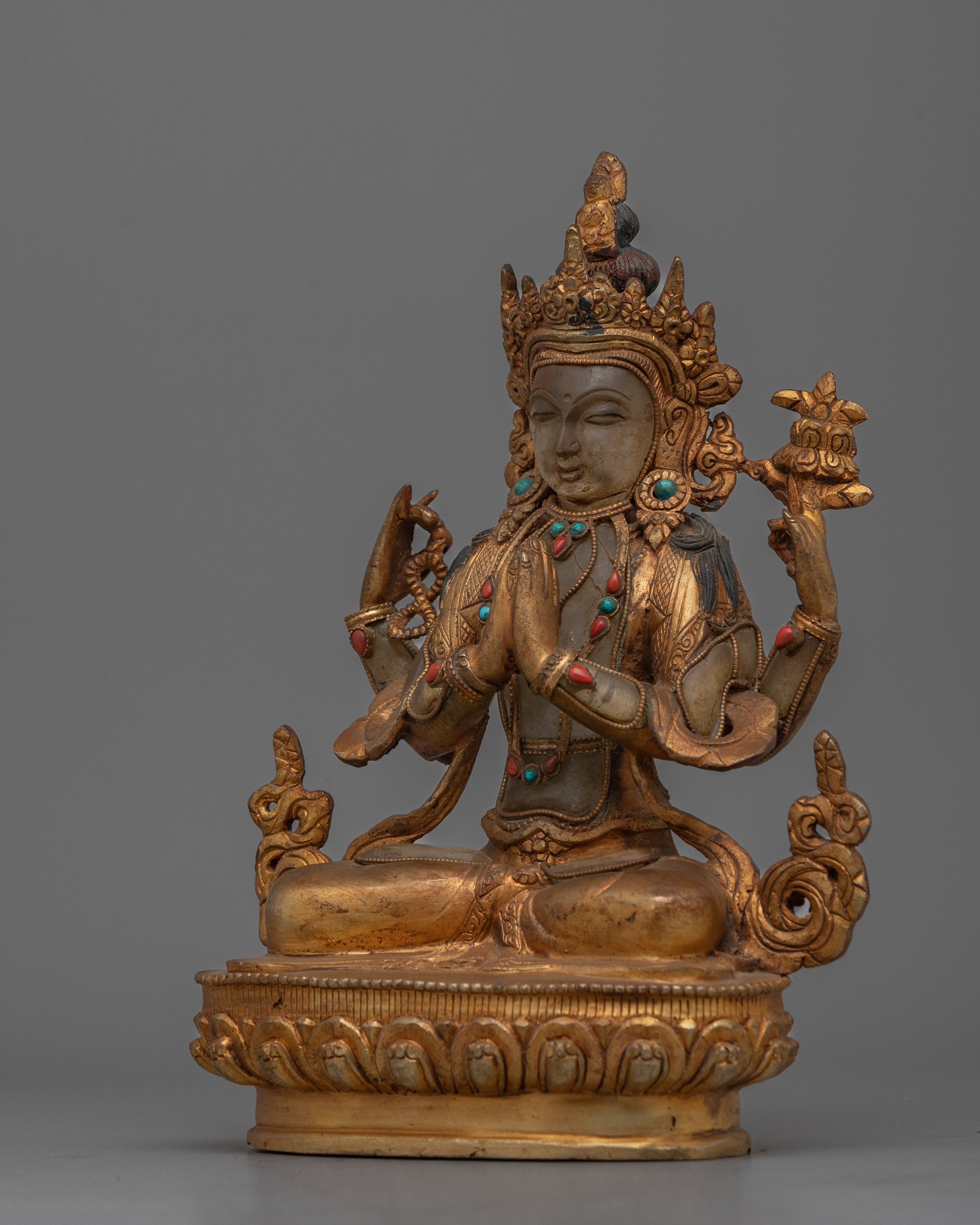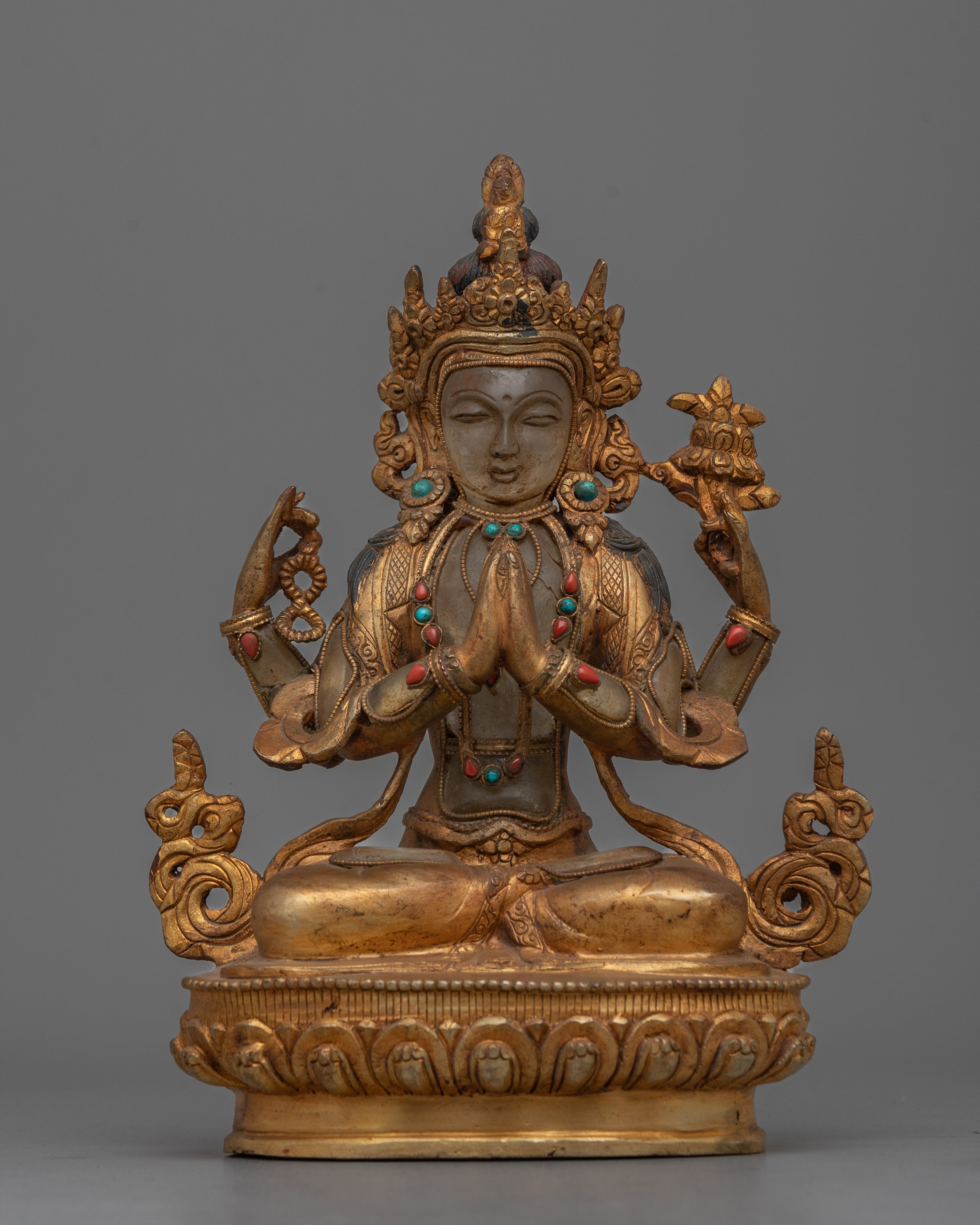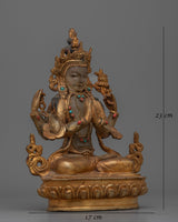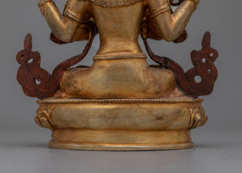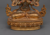 Introducing the "Chenrezig Crystal Body" monument, a luminous representation of the bodhisattva of compassion. This 9.1-inch statue wonderfully depicts Chenrezig in a crystal body, representing the clarity and purity of compassionate purpose. It exudes a profound sense of peace and generosity, thanks to its 24K gold plating and carefully chosen gemstones. The antique finish lends a timeless aspect, highlighting the fine details of his rich jewelry and symbolic lotus seat.