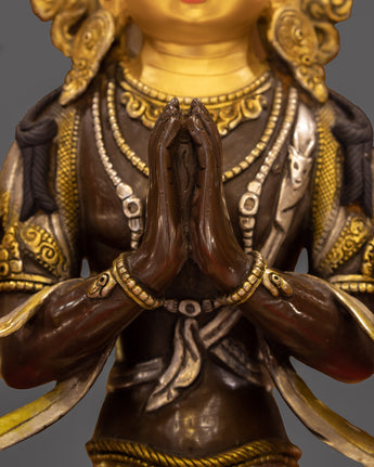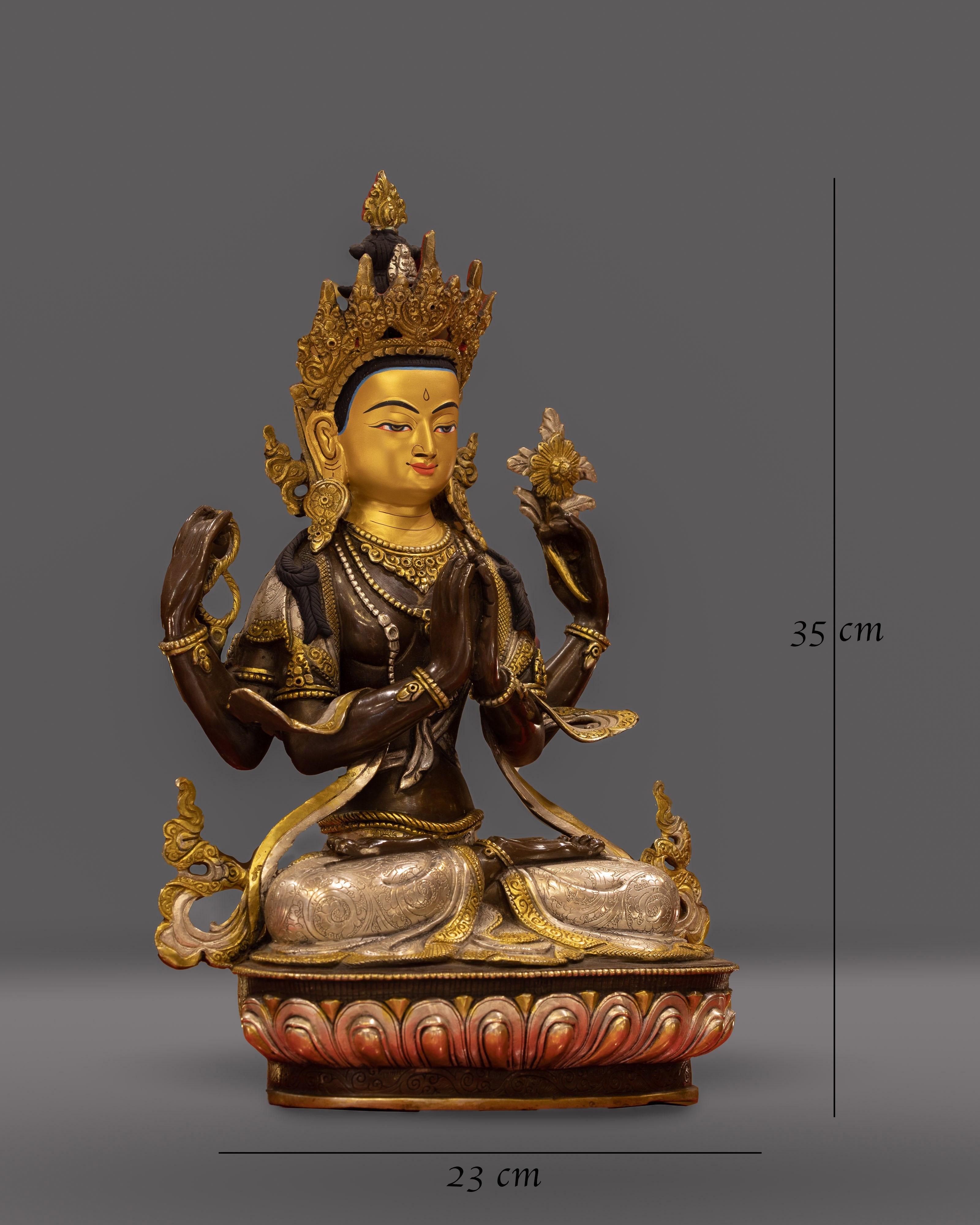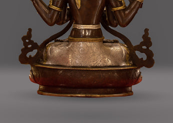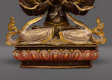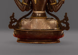 A warm, inviting glow emanates from the wrought oxidized copper body of this sculpture, which is further enhanced with 24K gold plating. This magnificent mix represents the purity and spiritual richness that Chenrezig exudes, as well as highlighting his calm expression and intricate decorations. His traits are brought to life by the gold and acrylic paintings, particularly the four arms that bear symbolic objects that stand for the instruments of protection and compassion.