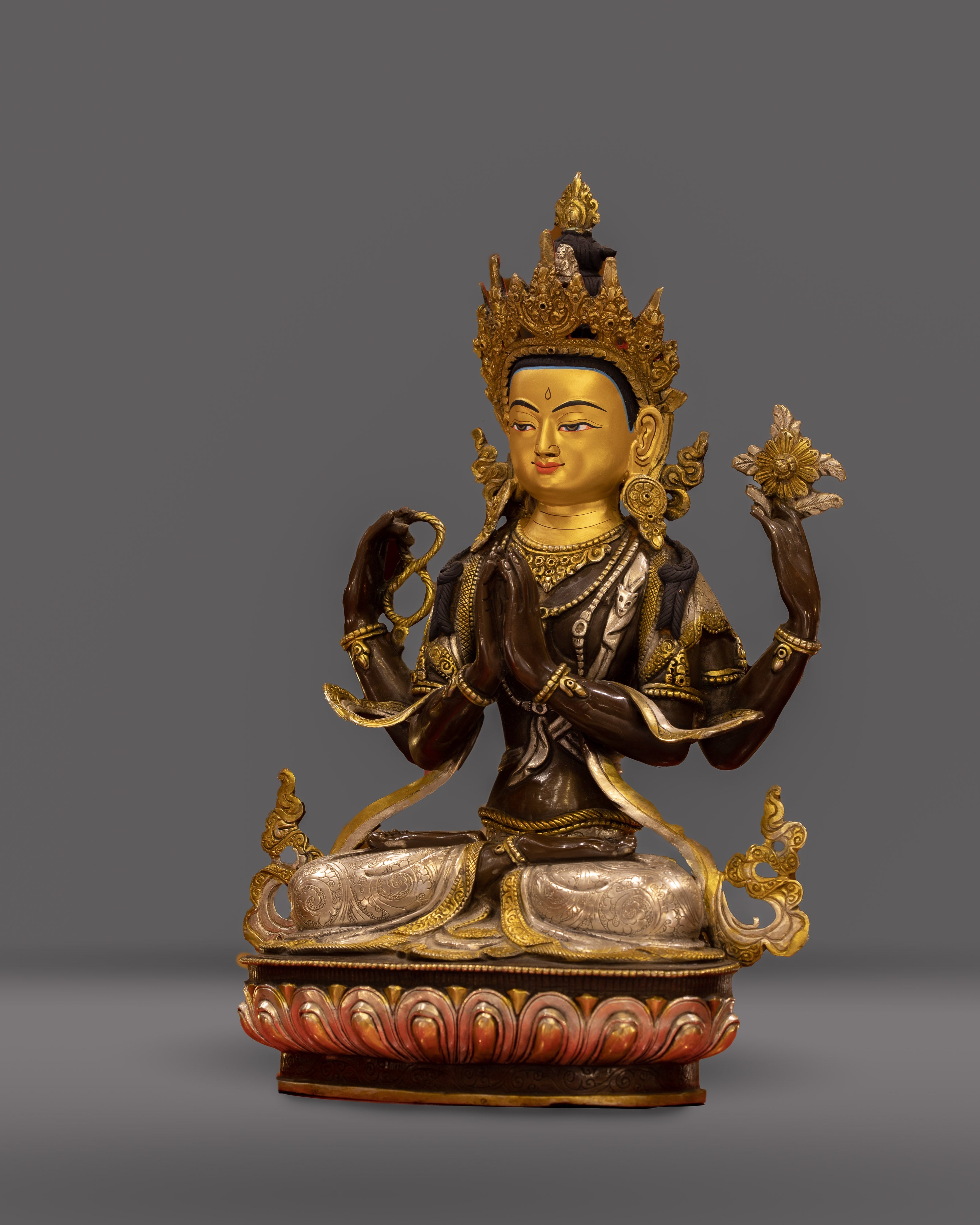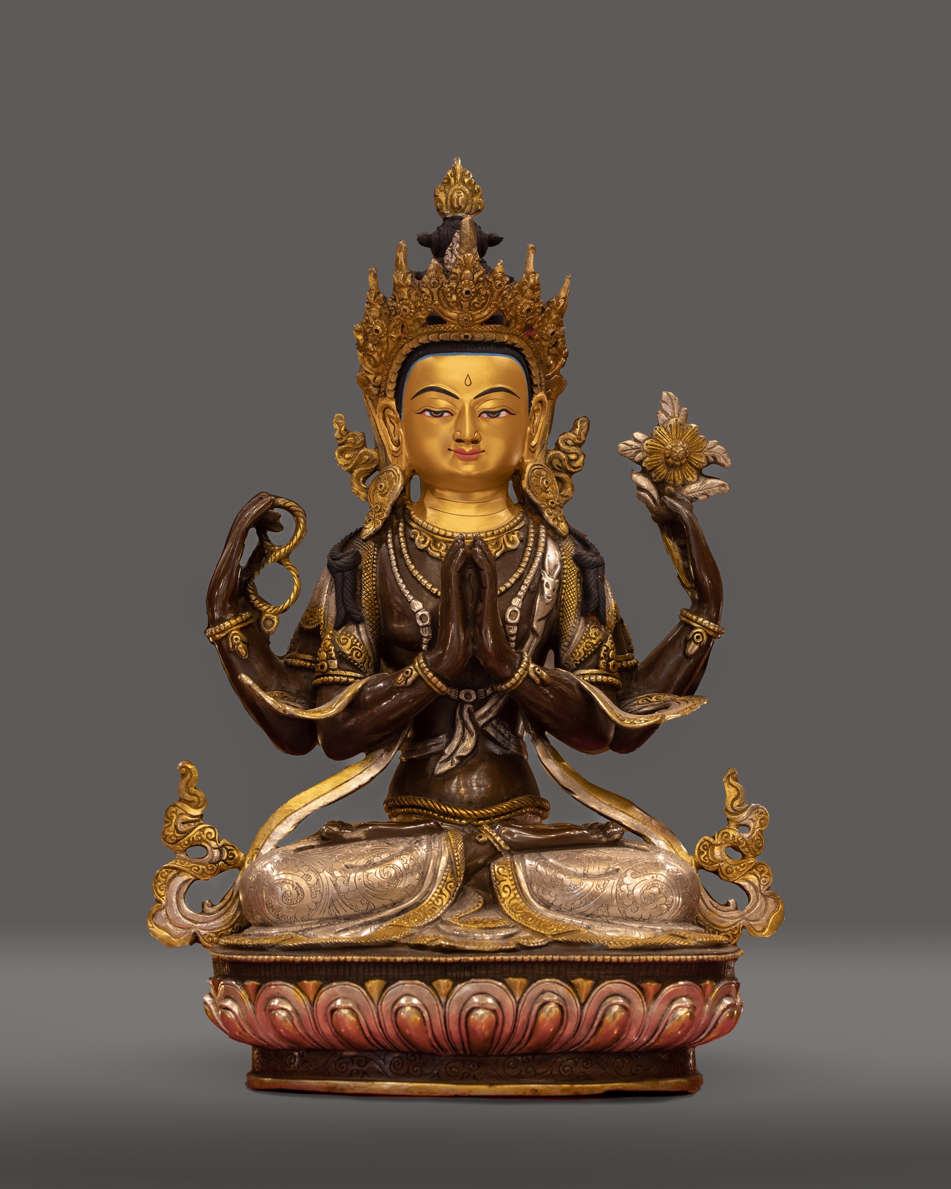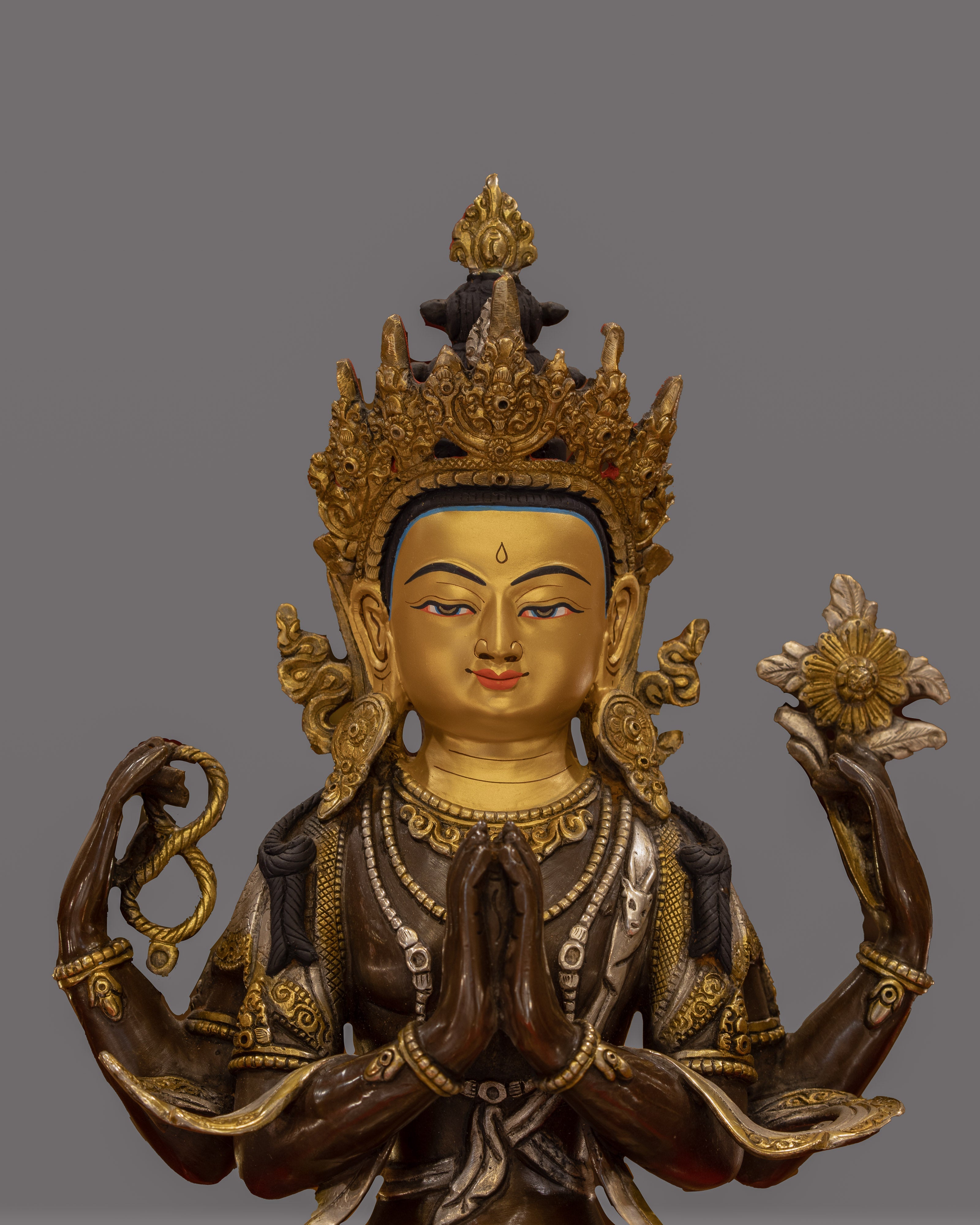 Chenrezig Four-Armed Sculpture | Compassion in 24K Gold and Oxidized Copper