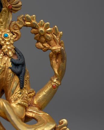 Embrace kindness and love with the Loving Kind Deity Statue by Chenrezig. This lovely statue, which stands 5.5 inches tall and weighs 0.588 kg, radiates an infinite amount of generosity and compassion. Perfectly created from the best materials—such as 24K gold-gilded copper—it gleams with elaborate paintings in acrylic and gold that perfectly capture Chenrezig's loving character. Call upon the blessings of Chenrezig as you develop compassion and love in your life and establish a connection with his compassionate presence. Whether on show in your home or a hallowed place