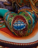 The colorful Diva green Tara statue invites you to enter the domain of divine feminine energy. This beautiful statue exudes spiritual brightness and grace, standing 15.4 inches tall and weighing 4.15 kilograms. Made of 24K gold-gilded copper and decorated with elaborate paintings in gold and acrylic, it embodies the caring energy of Green Tara in a vibrant way. Allow her to arouse your inner compassion and wisdom as you reflect on her sweet disposition and colorful features. She invites you to explore the limitless depths of the heart with her tranquil expression and elegant posture.
