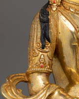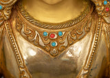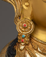 The compassionate Deity Amitayus is a revered figure in Buddhist practice, and this statue features a 24K gold-gilded finish, gold and acrylic paintwork, and a copper body. With dimensions of 15"/38cm (Height) x 10.6"/27cm (Base) and a weight of 4.30 kg, it is an ideal addition to meditation rooms or altars, encouraging peace and heavenly blessings.