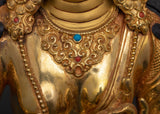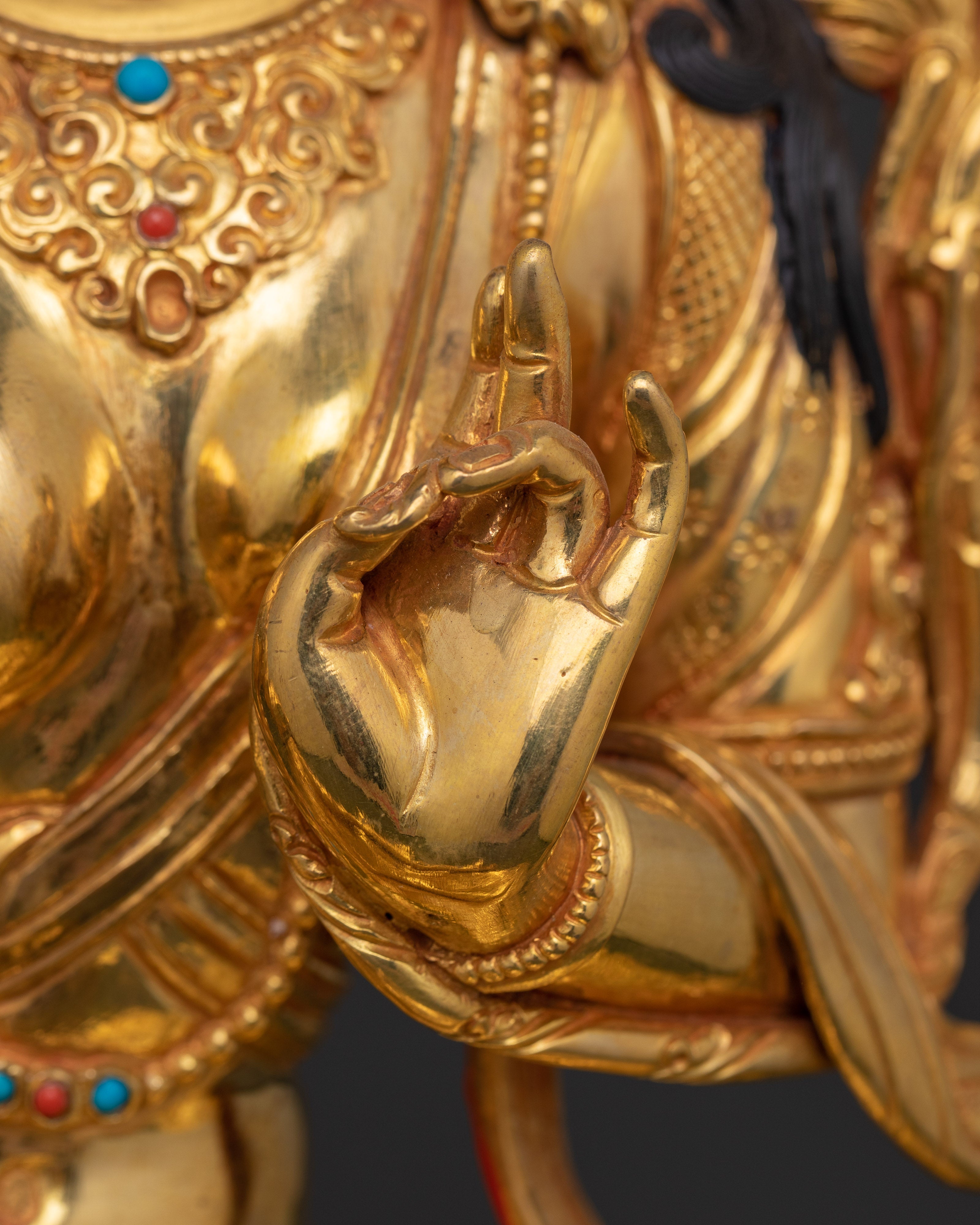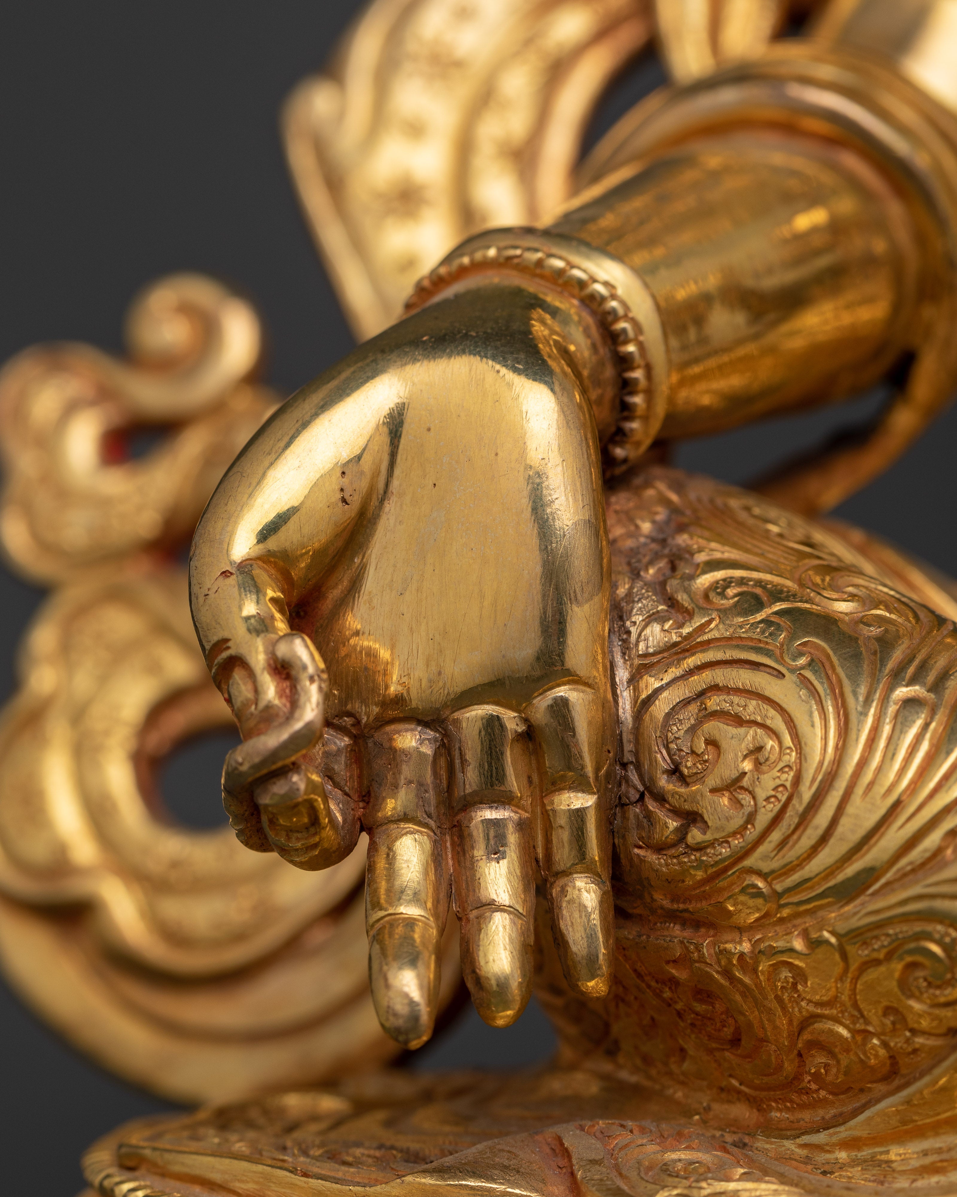 Green Tara is seated gracefully in the lotus pose, with her right hand extended in the gesture of great generosity (varada mudra), representing her willingness to assist all who call on her. Her left hand is raised in a protective gesture (abhaya mudra), which dispels fear and provides safety. Her brilliant green shape symbolizes growth, vigor, and the healing power of loving action. Every minute detail, from her embellished crown to the carved lotus base, exemplifies master craftsmanship, resulting in a magnificent piece of handmade Tibetan art.