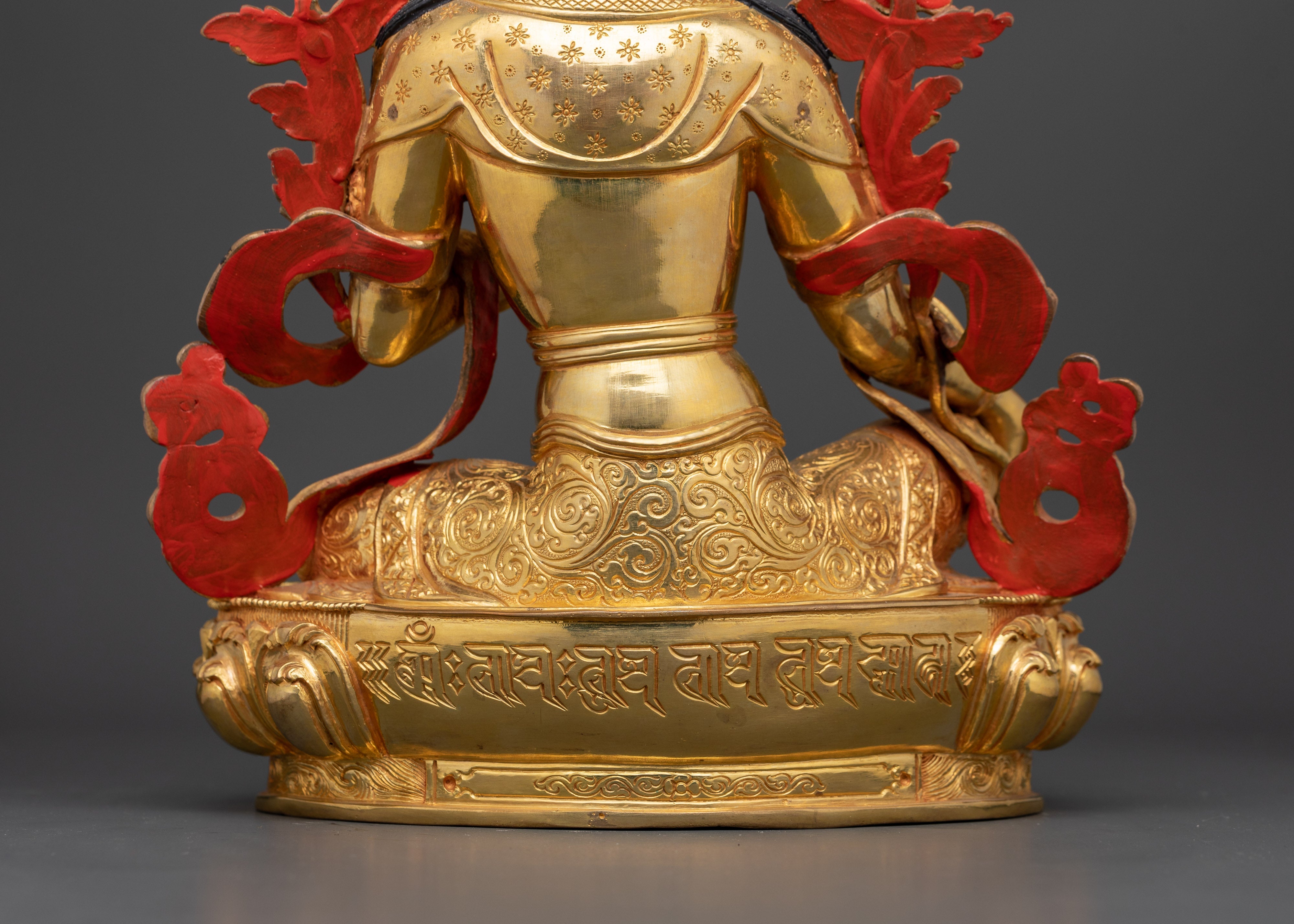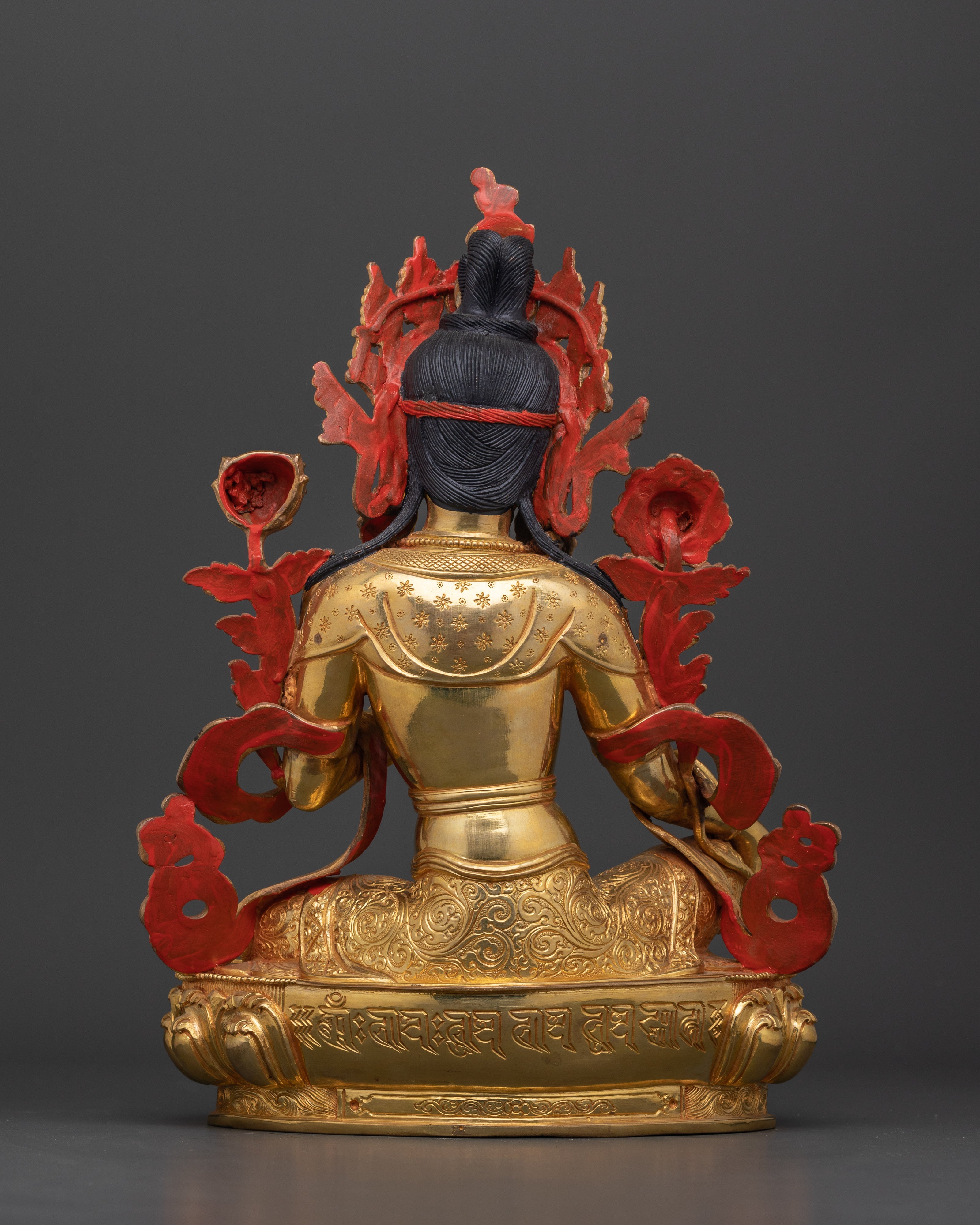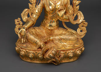 This handcrafted Compassionate Figurine Green Tara stands 13.2 inches (33.5 cm) tall with a base width of 9.4 inches (24 cm). The statue weighs 3.99 kg and is built of 24K gold gilded, gold and acrylic paintings, and a robust copper body, making it a great addition to your Buddhist altar or sacred area. Green Tara, also known as the Mother Tara and the Buddhist Goddess of Compassion, is adored in Tibetan Buddhism for her fast help and protective qualities.