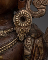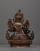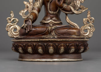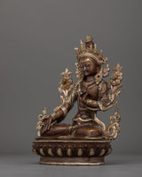 The Buddhist Goddess White Tara of Compassion and Healing is a revered figure in Tibetan Buddhism, symbolizing purity, wisdom, and long life. This statue, created in Patan, Nepal, represents the skilled artisans. Standing 8.9 inches tall with a 7.1-inch base, the figure is made of oxidized copper and has a silver-plated finish. These materials provide a harmonious balance of power resulting in a timeless piece of religious art.