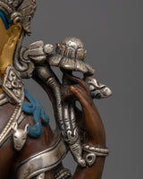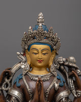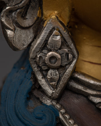 The Compassionate Protector Avalokiteshvara, stands at 9.4 inches (24 cm) in height with a base width of 6.5 inches (16.5 cm). Made from oxidized copper and silver-plated for a polished finish, the statue is adorned with exquisite 24K gold gilding, highlighting Chenresig’s compassionate form. Intricate gold and acrylic paintings add depth and vibrancy to the figure, enhancing its peaceful and serene presence. Representing Avalokiteshvara, the Bodhisattva of Compassion, this statue symbolizes mercy, healing, and the embodiment of unconditional love.