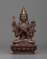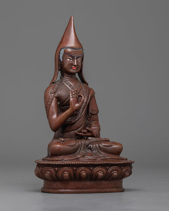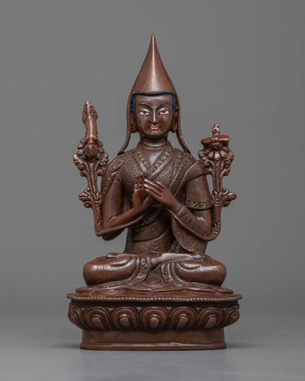 These beautiful statues are handcrafted in century-old Nepali art by Nepali artists. Made from copper, the Buddhist masters are sitting on a lotus seat wearing a monk hat (Yellow hat). Tsongkhapa is holding an upright standing sword atop a lotus flower on his right shoulder, and on his left, he is having a sutra atop a lotus flower.